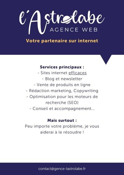 Je crée une EURL, l'Astrolabe, au lieu de me mettre en auto-entrepreneur (erreur coûteuse que je n'arriverai à rectifier qu'en 2023). J'adopte une posture similaire à celle de mon ancienne agence : très professionnelle et sérieuse (c'est tout ce que j'ai connu après tout, mais ça ne me ressemble pas). Je n'arrive pas à choisir entre la rédaction et le développement, donc je propose les deux et à tout le monde. Je ne sais pas vendre.